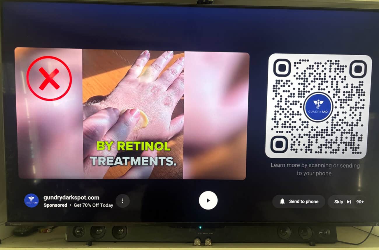 Note: Google can automatically generate a QR code overlay for Connected TV (CTV) ads based on your destination URL (see below for an example from the YouTube app on Amazon Fire TV), and this appears after 5 seconds. You can also manually incorporate a custom QR code directly into your video file during production to ensure it appears across all device types.